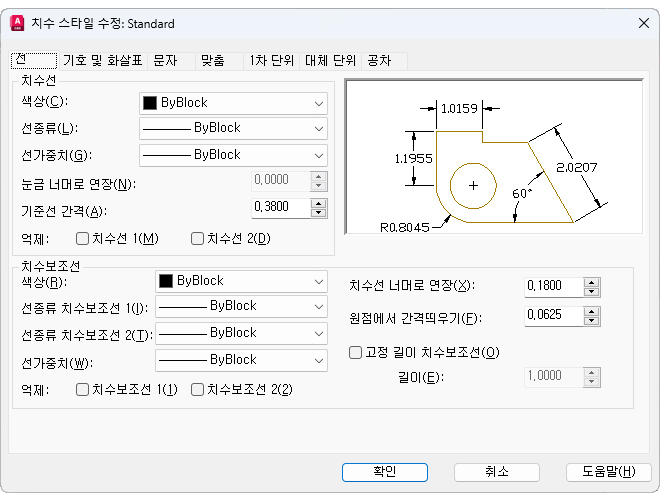 기본 치수 스타일의 이름은 표준(영국식) 또는 ISO-25(미터법)입니다. 기본 치수 스타일은 사용자가 다른 스타일을 현재 도면 스타일로 설정할 때까지 모든 치수에 지정됩니다.