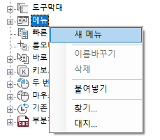 사용자화 탭에 있는 <파일 이름>의 사용자화 창에서 메뉴 노드를 마우스 오른쪽 버튼으로 클릭합니다. 새 메뉴를 클릭합니다.