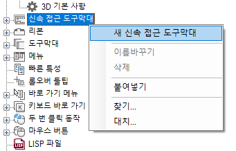 - 사용자화 탭에 있는 <파일 이름>의 사용자화 창에서 신속 접근 도구막대 노드를 마우스 오른쪽 버튼으로 클릭합니다. 새 신속 접근 도구막대를 클릭합니다.