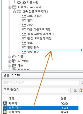 - 신속 접근 도구막대에 추가할 명령 또는 컨트롤을 명령 리스트 창에서 <파일 이름>의 사용자화 창으로 끕니다.