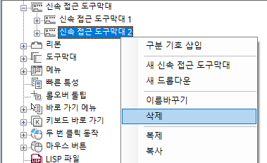 - 삭제할 신속 접근 도구막대를 마우스 오른쪽 버튼으로 클릭하고 삭제를 클릭합니다.