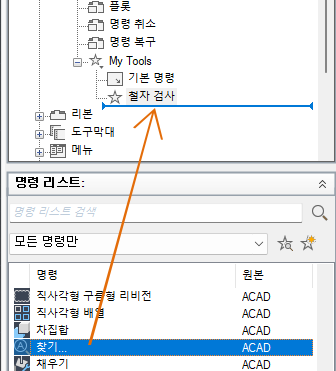 - 드롭다운 메뉴에 추가할 명령 또는 컨트롤을 명령 리스트 창에서 <파일 이름>의 사용자화 창으로 끕니다.