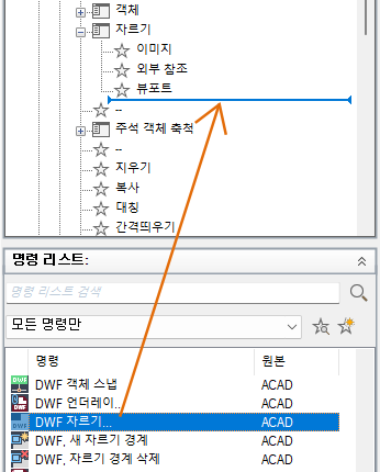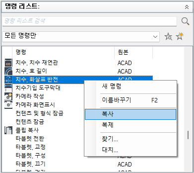 - 사용자화 탭의 명령 리스트 창에서 복사할 명령을 찾습니다.