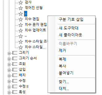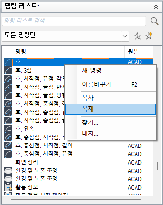 - 사용자화 탭의 명령 리스트 창에서 복제할 명령을 찾습니다.