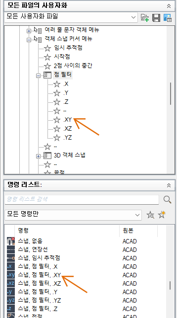 리스트가 필터링되어 로드된 사용자화 파일에 추가된 사용자 정의 명령만 표시됩니다.
