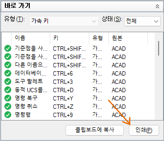 바로 가기 키 또는 임시 재지정 키의 리스트 인쇄