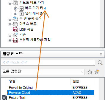 - 바로 가기 키를 작성하려면 명령 리스트 창에서 <파일 이름>의 사용자화 창의 바로 가기 키 노드로 명령을 끌어옵니다.