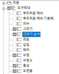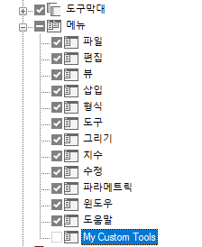 - <파일 이름>의 사용자화 창에서 도구막대 노드 옆에 있는 더하기 기호(+)를 클릭하여 노드를 확장합니다.