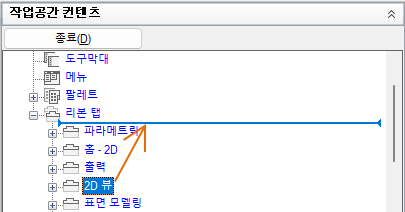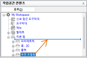 - 작업공간 컨텐츠 창에서 리본 탭 노드 옆에 있는 더하기 기호(+)를 클릭하여 확장합니다.