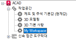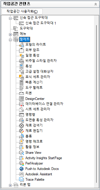 - 사용자화 탭에 있는 <파일 이름>의 사용자화 창에서 작업공간 노드 옆에 있는 더하기 기호(+)를 클릭하여 노드를 확장합니다.