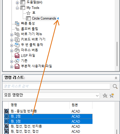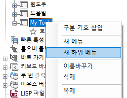 명령 리스트 창에서 하위 메뉴에 추가할 명령을