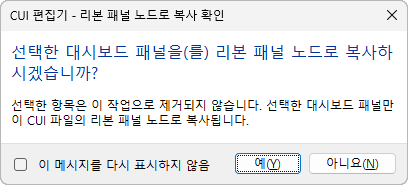 3. CUI 편집기 - 리본 패널 노드로 복사 확인 대화상자에서 예를 클릭합니다.
