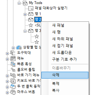 행 또는 하위 패널 제거