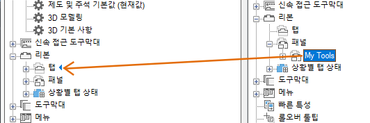 7. 오른쪽에 있는 <파일 이름>의 사용자화 창에서 왼쪽에 있는 <파일 이름>의 사용자화 창에 로드된 CUIx 파일의 패널 노드로 새 리본 패널을 끕니다.