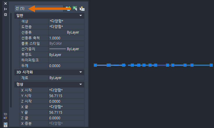 특성 팔레트에는 5개의 선이 선택되었음이 표시됩니다.