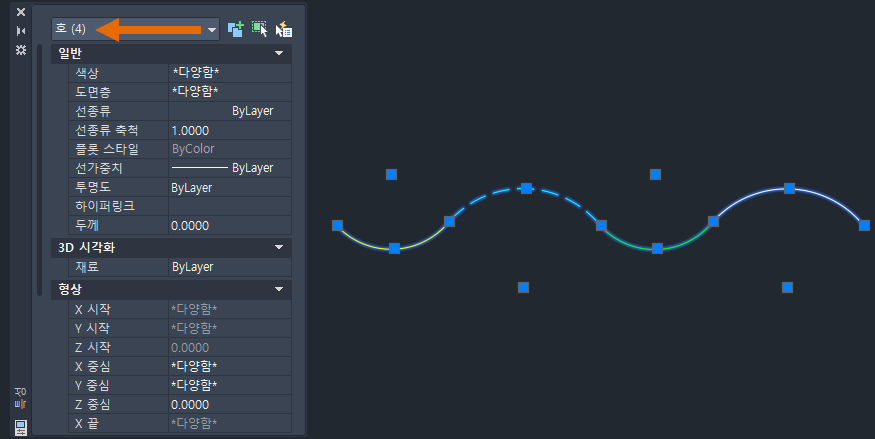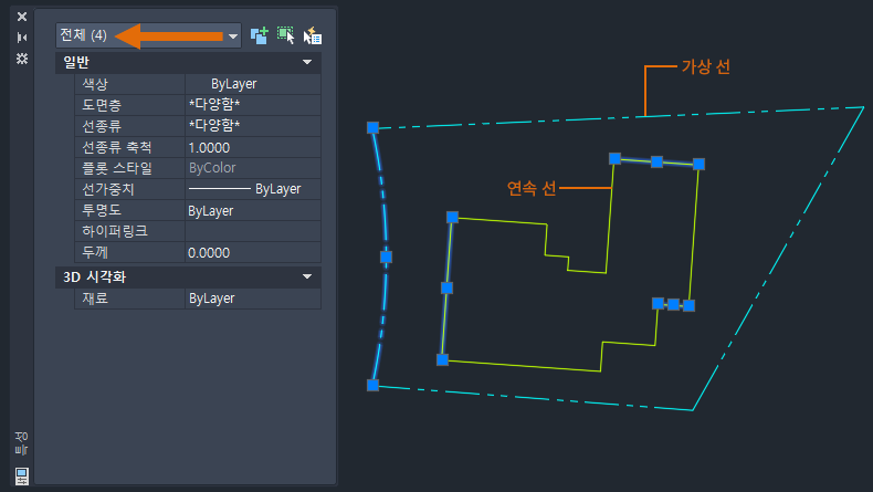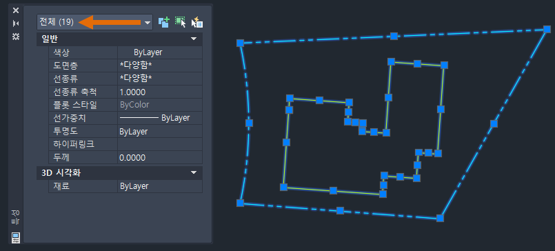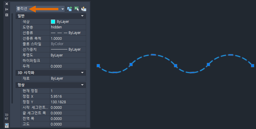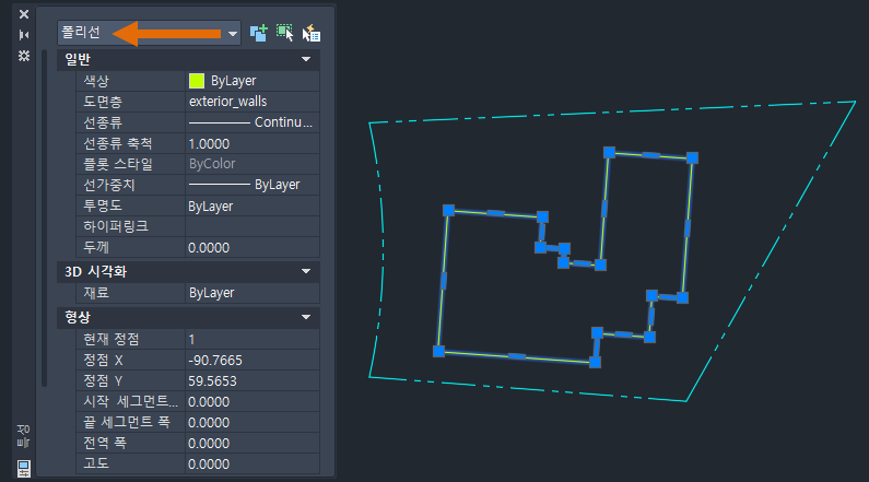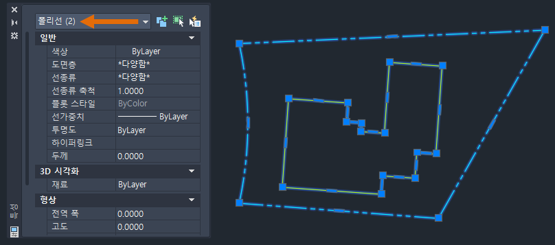 이제 연속선을 선택하면 특성 팔레트에 폴리선 객체로 표시됩니다.