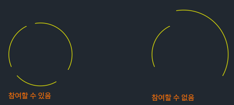 이제 원이 여러 호 세그먼트로 나뉘어 있다고 가정합니다. 이러한 호는 동일한 중심점과 반지름을 공유하므로, 호 사이에 간격이 있더라도 결합할 수 있습니다.