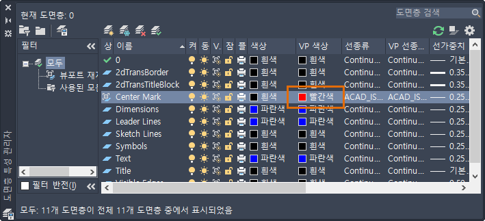 중심 표식 도면층의 색상을 빨간색으로 변경합니다. 색상이 이 뷰포트에만 변경되도록 하려면 VP 색상 열에서 색상을 선택합니다.