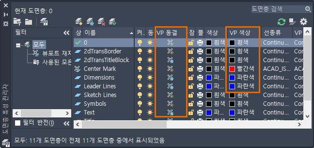 이제 일부 도면층 특성을 변경하고 다른 도면층 상태를 저장하겠습니다.