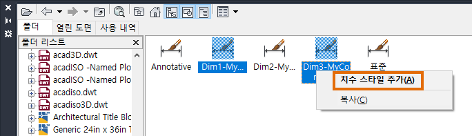 마우스 오른쪽 버튼을 클릭하고 치수 스타일 추가를 선택합니다.
