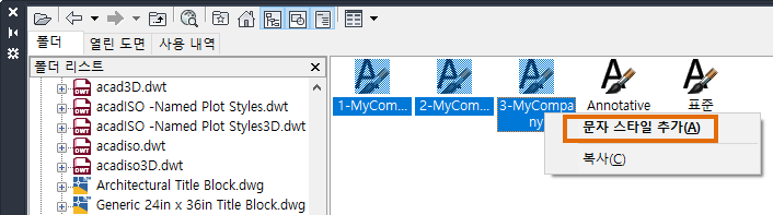 가져올 스타일을 선택하고 마우스 오른쪽 버튼을 클릭한 후 문자 스타일 추가를 클릭합니다.