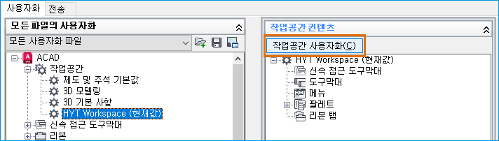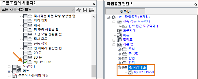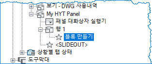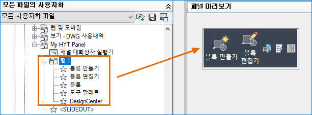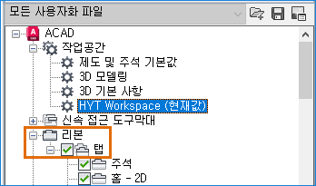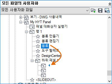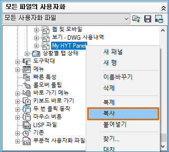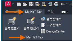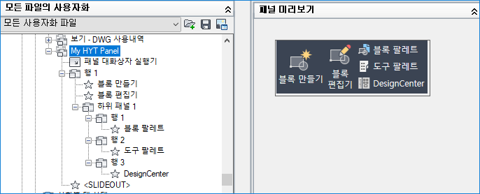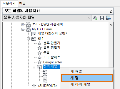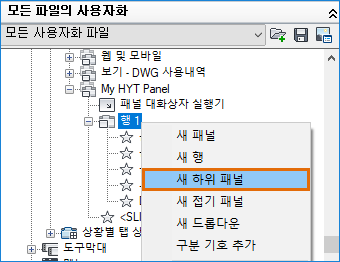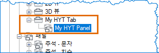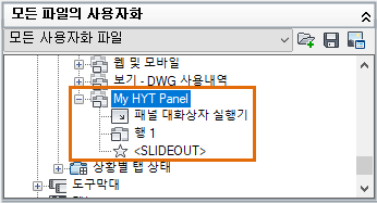 필요한 경우 CUI 편집기에서 새로 작성한 리본 패널(My HYT Panel)을 찾습니다.