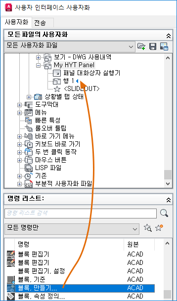 명령 리스트 창의 명령 리스트 검색 문자 상자에 block을 입력합니다. Make Block(BLOCK 명령)을 선택하고 My HYT Panel 아래에 있는 행 1로 끕니다.