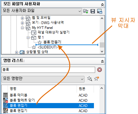 이 연습에서는 방금 추가한 리본 패널인 My HYT Panel에 블록 관련 명령 5개를 추가합니다.