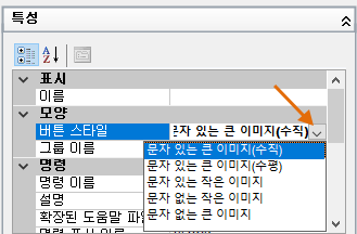 특성 창의 오른쪽에 있는 모양에서 버튼 스타일 드롭다운 리스트를 클릭하고 문자 있는 큰 이미지(수직)를 선택합니다.