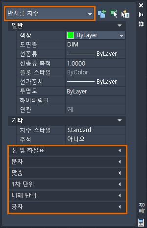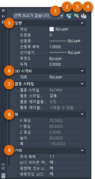 | 5 | 일반 | 선택한 객체의 일반 특성이나 현재 도면의 설정(아무 것도 선택하지 않은 경우)을 표시합니다. 이 섹션에는 도면층 도구 세트도 포함되어 있습니다. |