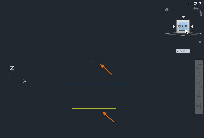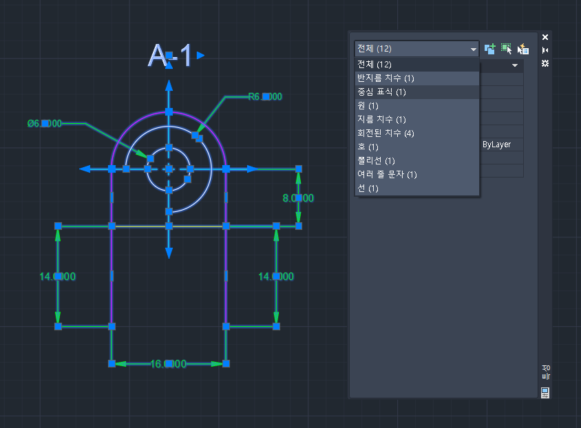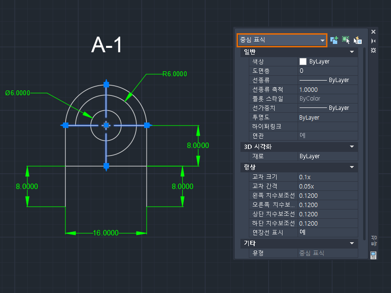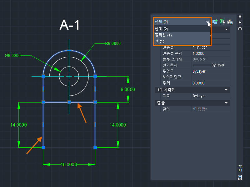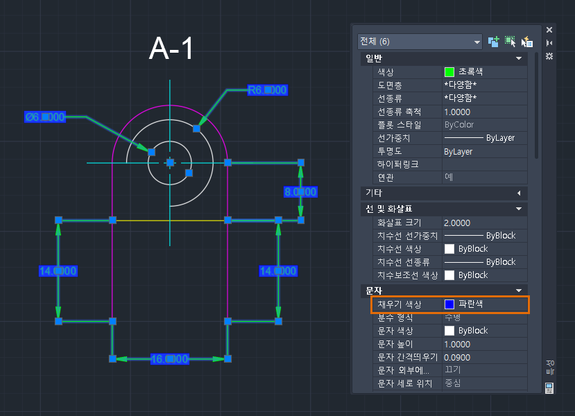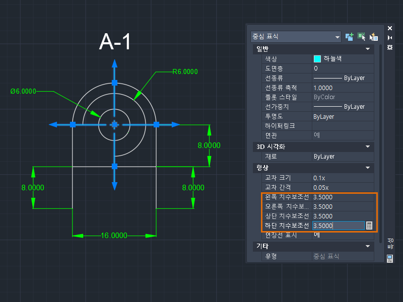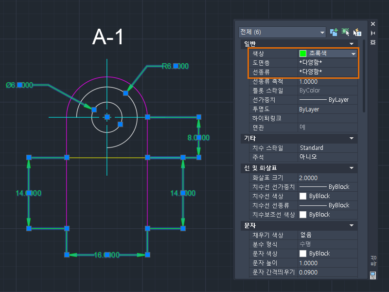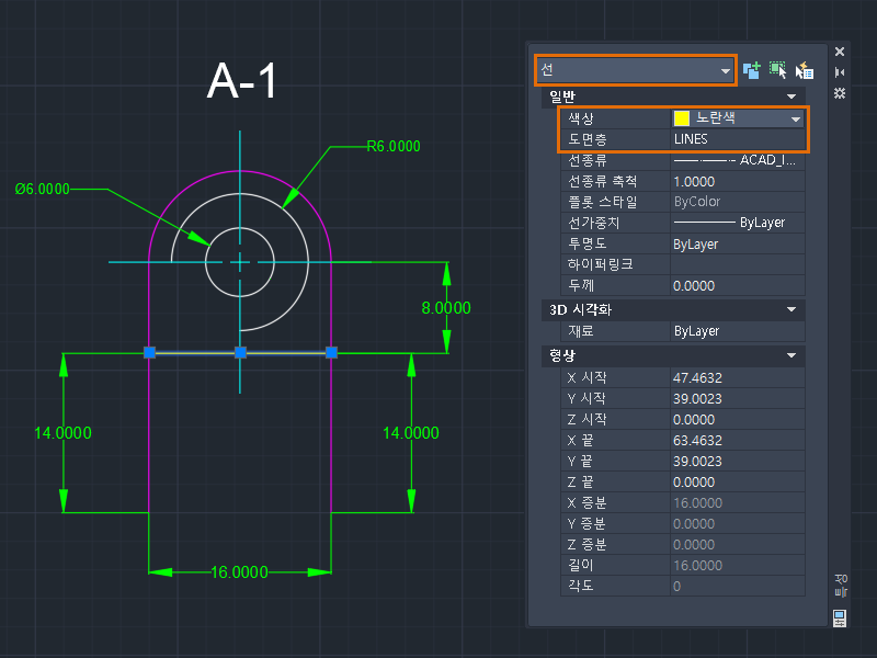 치수는 동일한 색상으로 표시되지만 치수에 지정된 도면층과 선종류가 달라지는 것을 볼 수 있습니다.