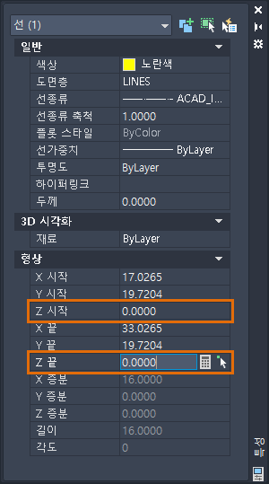 Z축 좌표의 값이 0 또는 *다양함*이 아닌 경우, 이는 선택한 객체 중 하나 이상이 동일평면상에 있지 않음을 의미합니다.