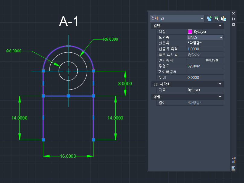 특성 팔레트는 도면의 현재 설정을 표시하는 것 외에도 객체 특성을 편집할 수 있는 강력한 도구입니다. 이 연습에서는 간단한 기계 부품의 특성을 약간 변경합니다.
