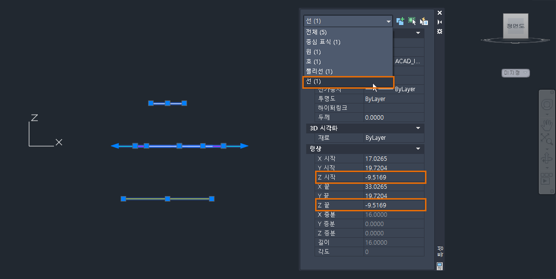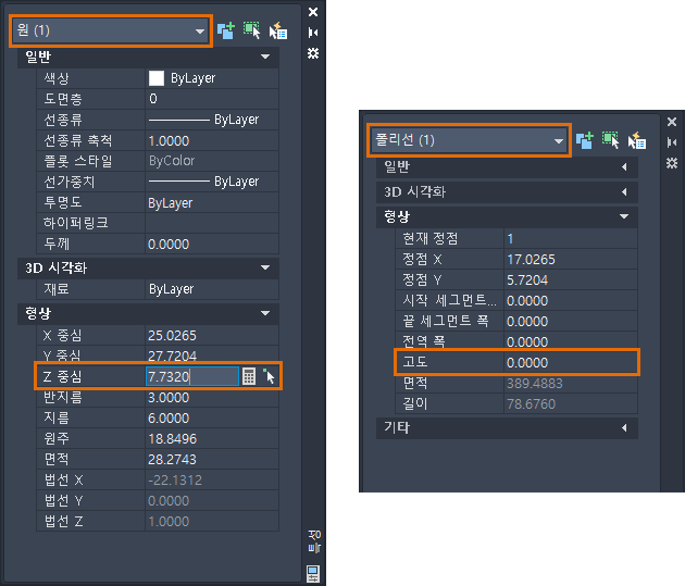 객체마다 Z축 특성 이름이 다릅니다. 객체에는 Z 시작, Z 끝, Z 위치(여러 줄 문자), Z 중심(원) 또는 고도(폴리선) 특성이 하나 또는 여러 개 있을 수 있습니다.