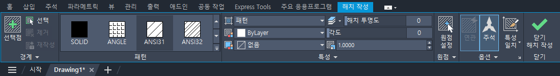 해치를 적용하거나 편집할 때 지정할 특성(예: 각도, 축척, 원점 등)을 지정하고자 할 수 있습니다.