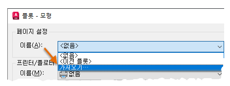 페이지 설정의 설정을 재지정하려면 간단히 플롯 대화상자에서 변경하면 됩니다. 그러면 페이지 설정의 이름이 <없음>으로 변경되며, 이 설정은 더 이상 해당 페이지 설정을 따르지 않습니다.