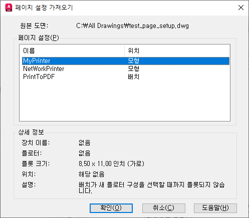 주: 명명된 페이지 설정을 도면 템플릿 파일에 추가하여 페이지 설정을 가져와야 하는 횟수를 줄일 수 있습니다. 그러면, 해당 템플릿을 기반으로 하는 모든 새 도면을 자동으로 사용할 수 있게 됩니다.