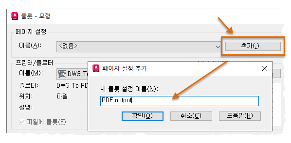 따라서, 다음번에 도면을 플롯할 준비가 되면 플롯 전에 추가 버튼을 클릭하고 나중에 사용할 수 있게 페이지 설정을 저장합니다. 이렇게 하면 플로터, 출력 장치 및 PDF 출력 간을 전환할 때 시간을 절약할 수 있습니다. 페이지 설정을 가져와 이전 작업을 활용하고 실수를 방지합니다.