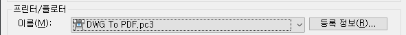 플롯 대화상자에서 저장하려는 해당 설정을 선택합니다. 예를 들어, 프린터/플로터의 이름의 경우 드롭다운 리스트를 스크롤하고 DWG To PDF.pc3을 클릭합니다.