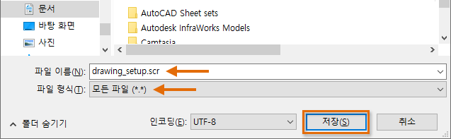 파일 이름 문자 상자에서 기본 문자를 선택하고 drawing_setup.scr을 입력합니다.