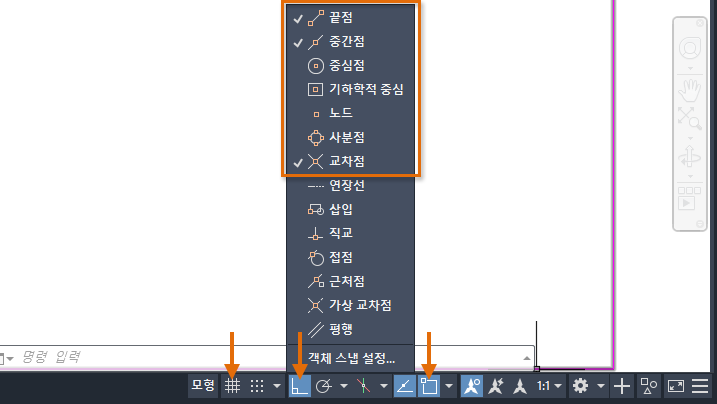 실행 중인 객체 스냅을 끝점, 중간점 및 교차점으로 설정