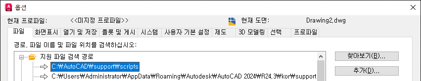 주: 옵션 대화상자(OPTIONS 명령)의 파일 탭에서 AutoCAD 지원 파일 검색 경로 설정의 폴더를 관리할 수 있습니다. AutoCAD 지원 파일 검색 경로 설정에 폴더를 추가하는 데 대한 자세한 내용은 지원 파일 검색 경로를 수정하려면을 참고하십시오.