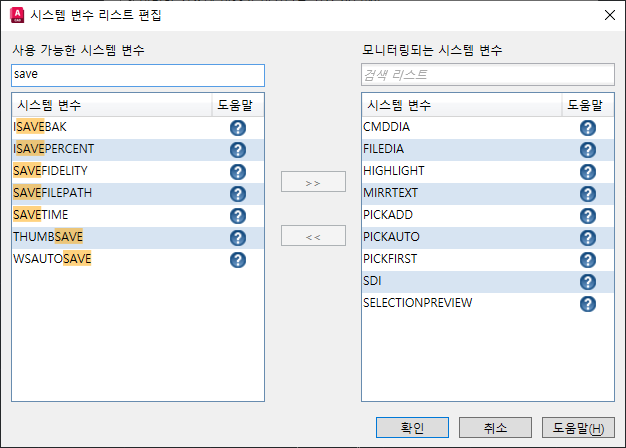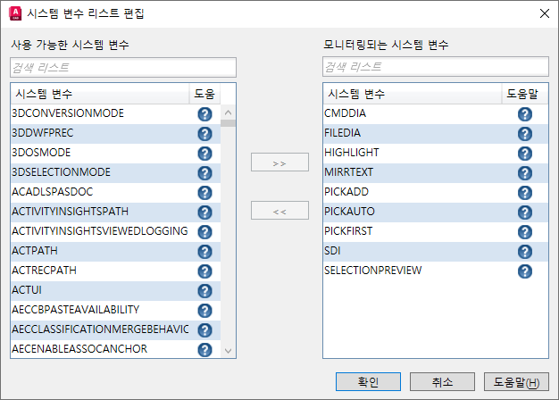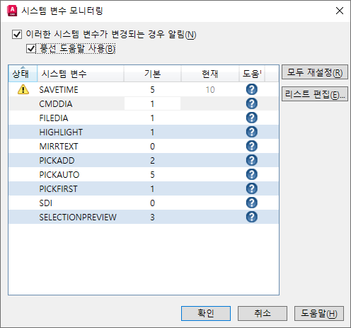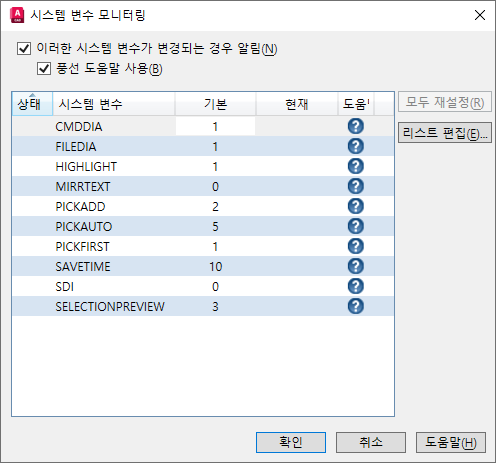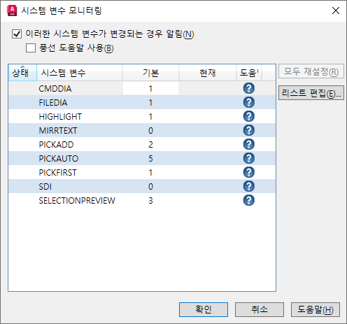 명령 프롬프트에서 SYSVARMONITOR를 입력합니다. 시스템 변수 모니터 대화상자에서 현재 모니터링되고 있는 시스템 변수를 볼 수 있습니다.