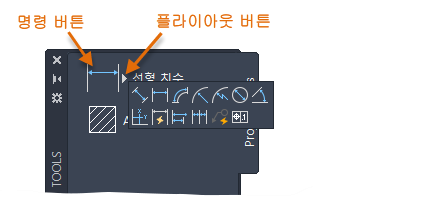 치수 객체를 도구 팔레트로 끌어 치수 도구를 작성할 수 있습니다. 새 치수 도구가 작성되면 도구에 플라이아웃 버튼이 포함됩니다.