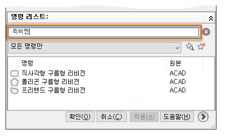 명령 리스트 창 아래의 사용자 인터페이스 사용자화(CUI) 편집기에서 명령 리스트 검색 문자 상자 안을 클릭하고 revision을 입력합니다.
