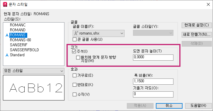 AutoCAD에서는 제공된 도면 문자 높이와 지정된 주석 축척을 기준으로 문자를 필요한 높이로 자동으로 계산하고 표시합니다.