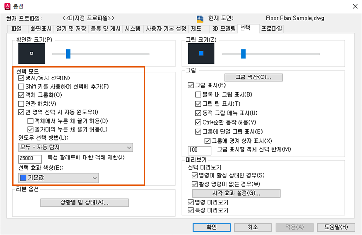 빈 영역 선택 시 자동 윈도우. 이 옵션을 선택한 경우 객체 외부의 점을 선택하면 선택 윈도우의 도면이 자동으로 시작됩니다. 이 옵션을 선택하지 않은 경우 객체를 선택하라는 메시지가 표시되면 윈도우 옵션을 지정해야 합니다.