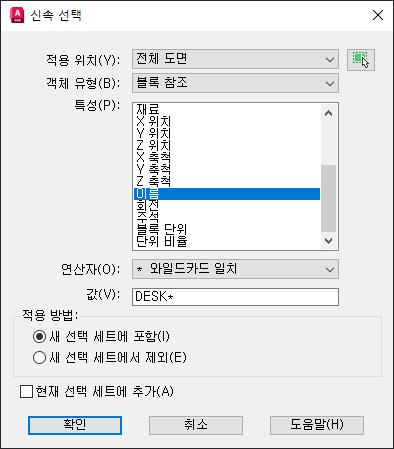 이름 DESK*와 일치하는 모든 블록을 선택하려 한다고 가정하겠습니다.