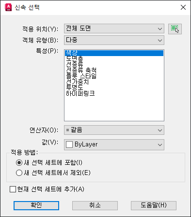| 선택한 객체의 특성과 일치하는 현재 도면 내의 모든 객체를 찾아 선택 세트에 추가합니다.