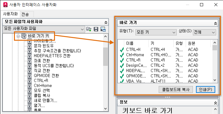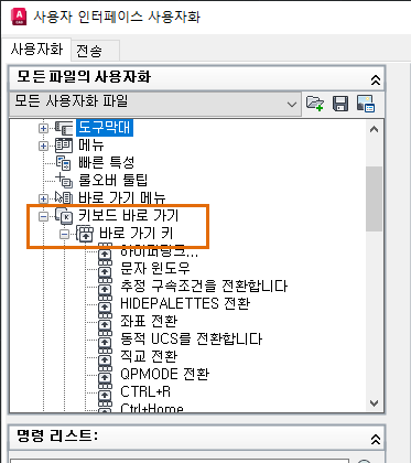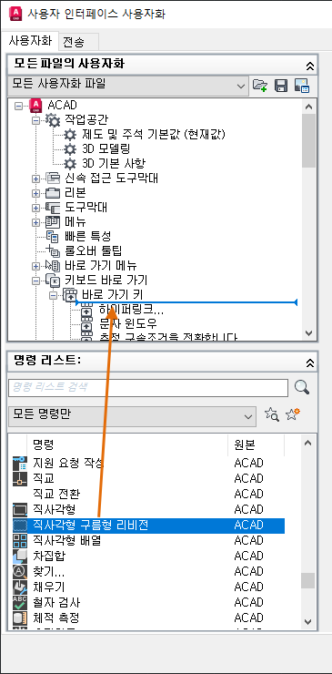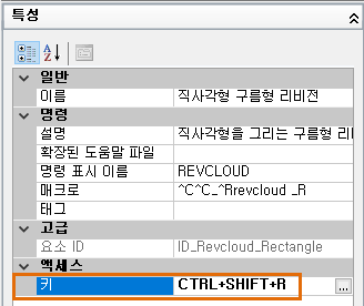 바로 가기 키는 사용자화(CUIx) 파일에 정의되어 있습니다. 이 예에서는 직사각형 옵션을 사용하여 REVCLOUD 명령을 실행하는 바로 가기 키를 정의합니다.